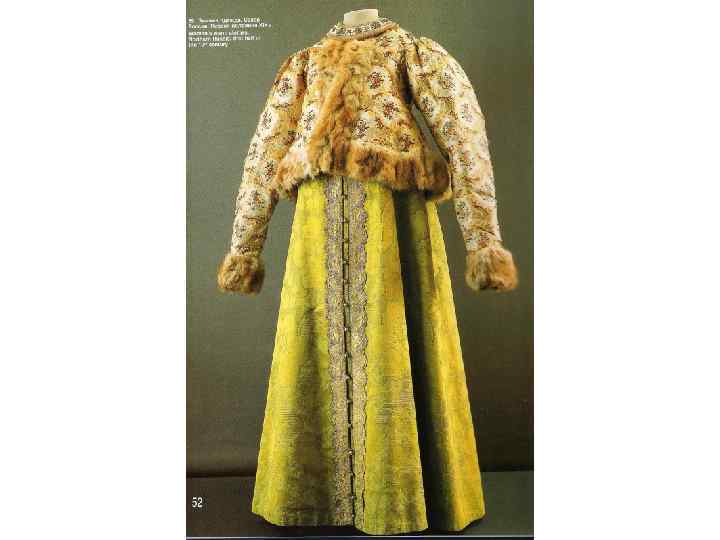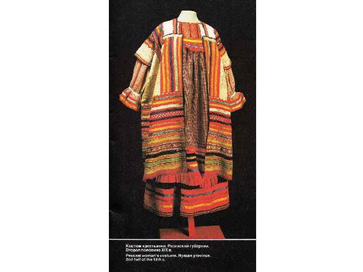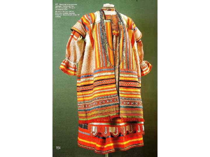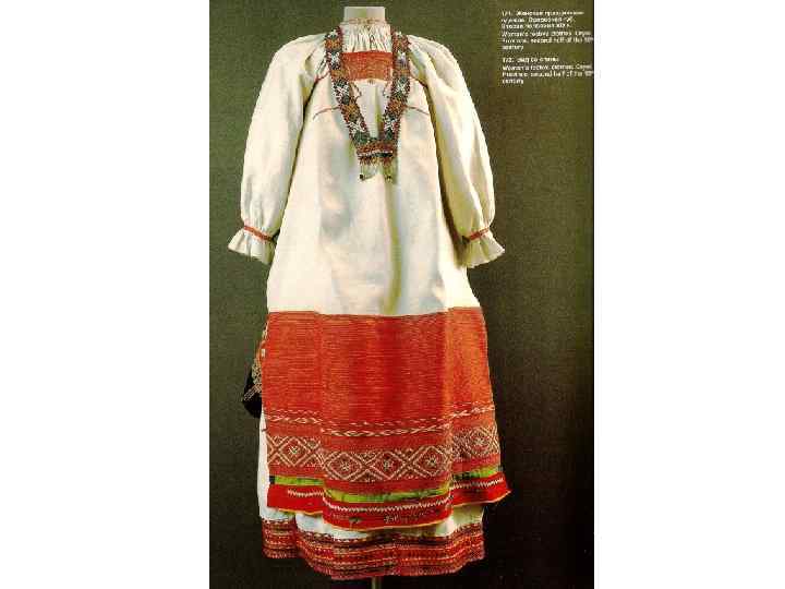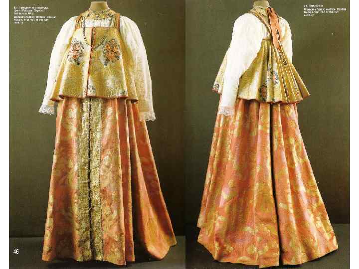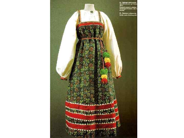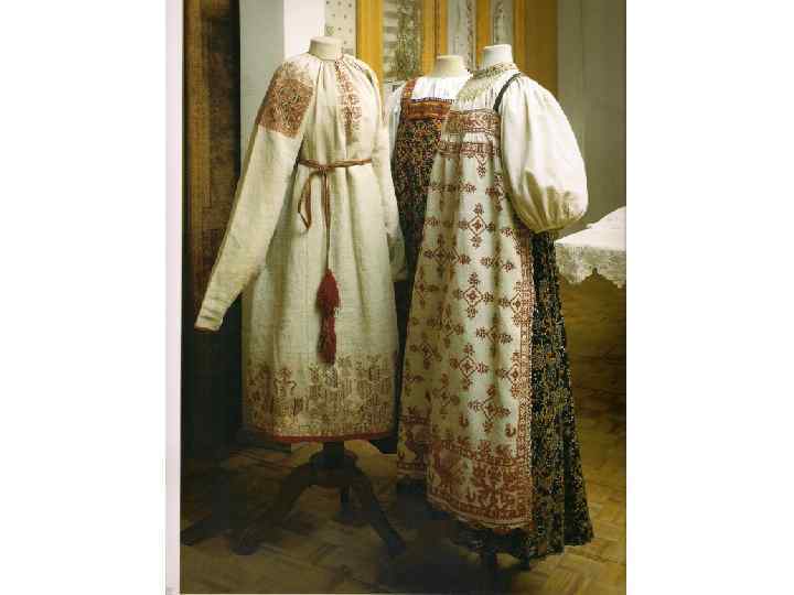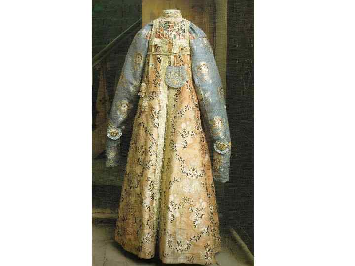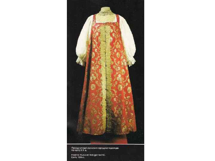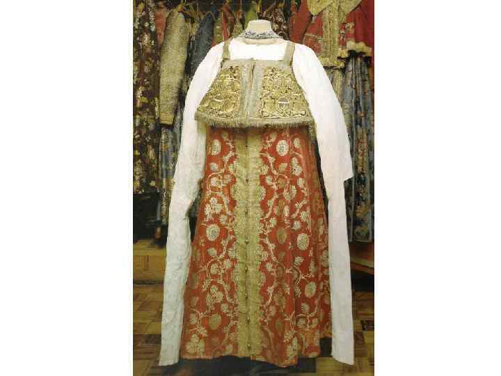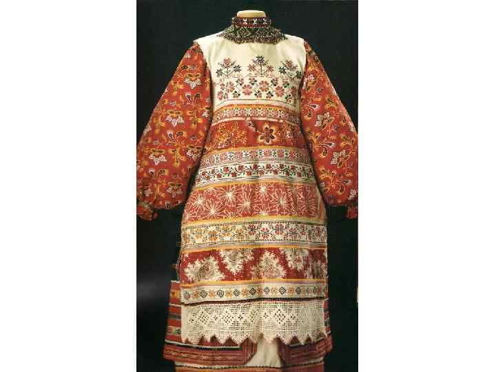КОМПОЗИЦИЯ КОСТЮМА: 1. РУБАХА С ДЛИННЫМИ ПОЛИКАМИ , ДЛИННАЯ, С ДЛИННЫМИ ШИРОКИМИ РУКАВАМИ, СОБРАННЫМИ У КИСТИ, ИЗ БЕЛОГО БАТИСТА. УКРАШЕНА ВЫШИВКОЙ БЕЛЫМИ НИТЯМИ ТАМБУРНЫМ ШВОМ И ОБОРКОЙ ИЗ БЕЛОГО ПЛЕТЁНОГО КРУЖЕВА ПО КРАЮ РУКАВА. 2. САРАФАН КОСОКЛИННЫЙ, РАСПАШНОЙ ИЗ УЗОРНОГО ШЁЛКА РУССКОЙ ФАБРИЧНОЙ РАБОТЫ 2 ПОЛОВИНЫ 18 В. , УКРАШЕН ЗОЛОТЫМ ЗУБЧАТЫМ ГАЛУНОМ. ПУГОВИЦЫ СЕРЕБРЯНЫЕ СО ВСТАВКАМИ ГОРНОГО ХРУСТАЛЯ. 3. ПОЯС ИЗ ЗОЛОТОГО ГАЛУНА, С КИСТЯМИ И ПОДВЕСКАМИ ИЗ ШЁЛКА, С ЗОЛОТЫМ ШИТЬЁМ И БАХРАМОЙ 4. ШЕЙНОЕ УКРАШЕНИЕ ИЗ ПОЛОС ХОЛСТА, ВЫШИТОГО РУБЛЕНЫМ ПЕРЛАМУТРОМ И ЦВЕТНЫМИ СТЁКЛАМИ