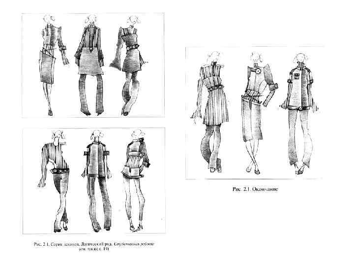 Приемы гармонизации композиции костюма Контраст — резкое различие формы, размеров, пластики, цвета, фактур. Контраст очень важен в моделировании, так как создает наиболее выразительную форму в целом, подчеркивает разность характеристик и придает динамичность общей форме костюма Эскизы моделей с контрастными формами в композиции костюма