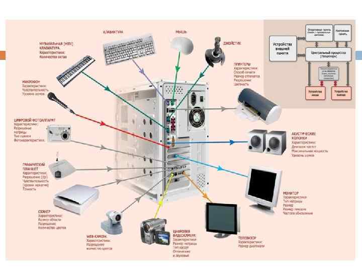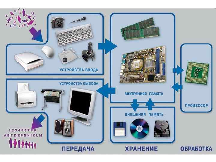 Функциональная схема компьютера. Человек плохо понимает информацию, представленную в двоичном компьютерном коде, и не воспринимает её в виде последовательностей электрических импульсов. Поэтому в состав компьютера входят устройства ввода и устройства вывода информации.