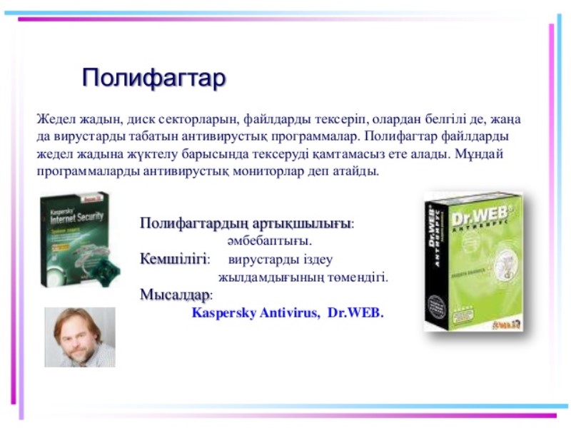 Полифагтар.Олардың қызметі-вирустарды табу ғана емес, оның кодасын жұқпалы (ауру жұққан) программадан жою.Өте қуатты полиграф-сканер И.Данилов құрған Dr. Web (Doctor Web) болып табылады.Ол вирустарды жақсы айырып таниды, бірақ оның базасында вирусқа қарсы күресетін құралдар басқа вирусқа қарсы программаларға қарағанда анағұрлым аз.Жалпыға әйгілі полифаг Е.Касперский зертханасы құрған Kaspersky Anti-Virus программасы вирусқа қарсы бірден-бір сенімді программа ретінде бүкіл әлемге әйгілі. Компьютер әлемін вирустардың жаулап алмауы үшін мынандай тапсырмаларды орындау керек.