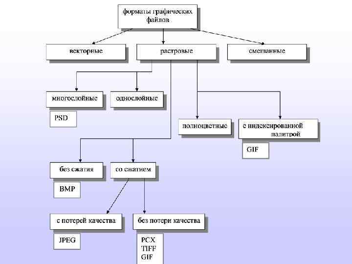 Форматы растровых графических файлов: BMP - используется для работы с продуктами фирмы Microsoft. TIFF - используется при сохранении отсканированного изображения, при подготовке к печати. JPEG - используется для сохранения изображений, предназначенных только для просмотра на экране, представления фотографий на Web-страницах. GIF - используется для представления на Web-страницах простых картинок и анимации.