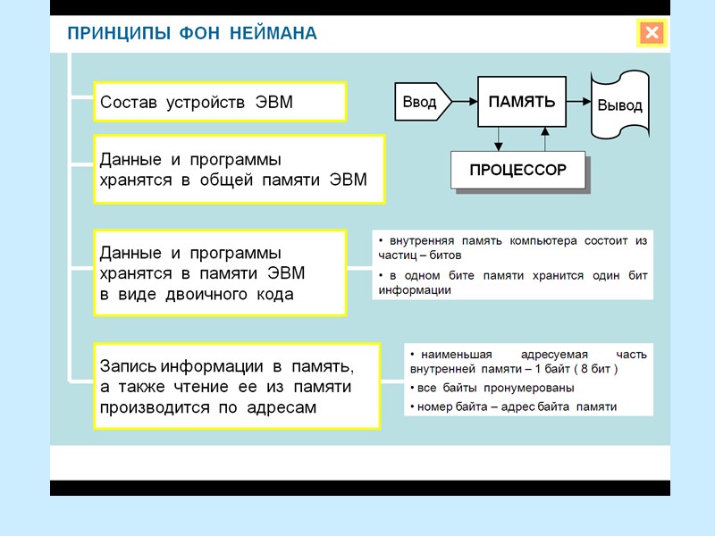 Это специальные электронные ячейки, каждая из которых хранит 1 байт информации. Данные и программы в памяти компьютера хранятся в виде двоичного кода. Наименьший элемент памяти ПК называется битом памяти. Битовая структура определяет первое свойство внутренней памяти – ДИСКРЕТНОСТЬ. ОПЕРАТИВНАЯ ПАМЯТЬ