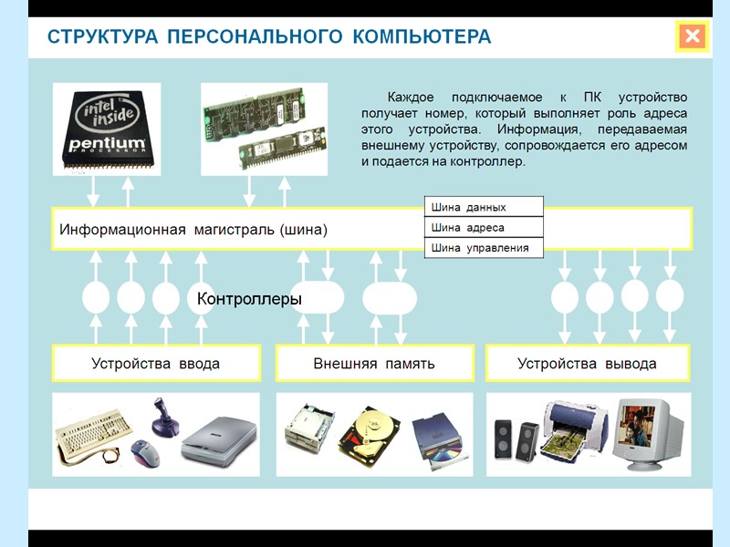 В процессе обработки информации некоторые данные или промежуточные результаты нужно сохранить, а некоторые нужно хранить постоянно, чтобы обеспечить саму работу ПК. Для этого в структуре компьютера имеются устройства, образующие её внутреннюю память. Внутренняя память входит в центральную часть ПК, так как постоянно взаимодействует с процессором. Внутренняя память компьютера – это набор ячеек хранения информации, имеющих номер и адрес. Общее их количество, доступное процессору, составляет его адресное пространство. Внутренняя память включает оперативную и постоянную составляющие. Внутренняя память