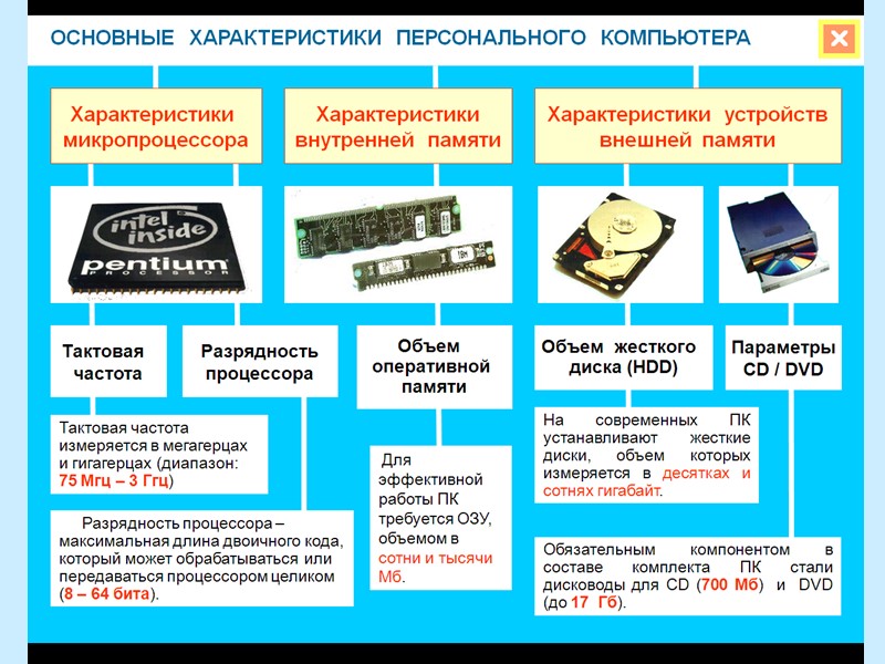 Постоянное запоминающее устройство (ПЗУ) хранит программы первоначальной загрузки и контроля оборудования, константы (энергонезависимая память). Оперативное запоминающее устройство (ОЗУ) хранит данные и программы (энергозависимая память) – динамическая память. Кэш-память (сверхоперативная память) хранит данные и команды, к которым исполняемая программа обращается наиболее часто – статическая память. Используется для увеличения быстродействия компьютера. Внутренняя память ПК: