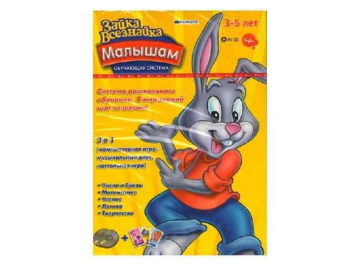 Компьютерная игра «Зайка Всезнайка» (4 -6 лет) Программа разработана при активном участии профессиональных педагогов и детских психологов. В процессе создания игры учитывались пожелания родителей, учителей и непосредственно детей, что позволило добиться максимальной эффективности образовательного продукта. «Зайка Всезнайка» прививает ребенку навыки самостоятельной игры, повышает уверенность в себе и стимулирует тягу к знаниям
