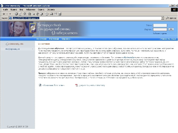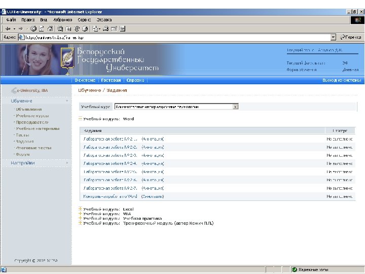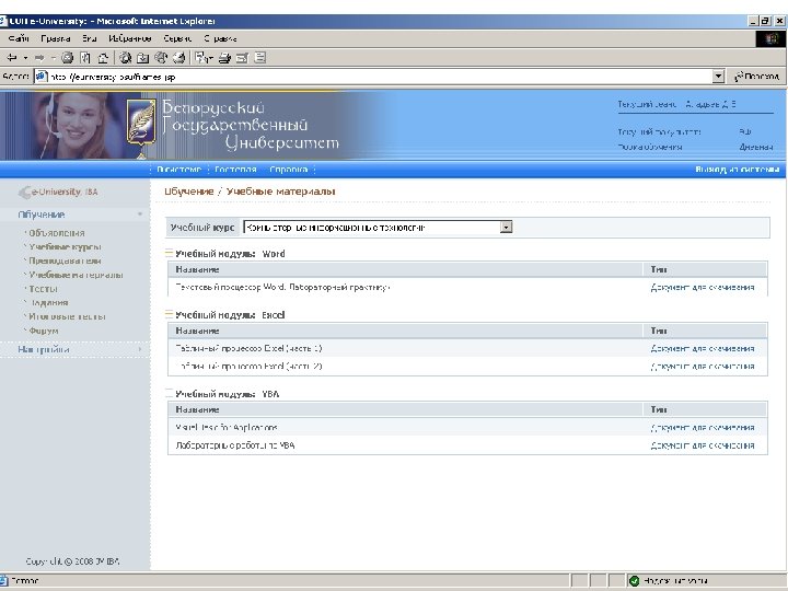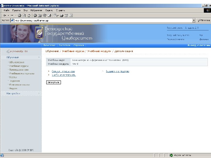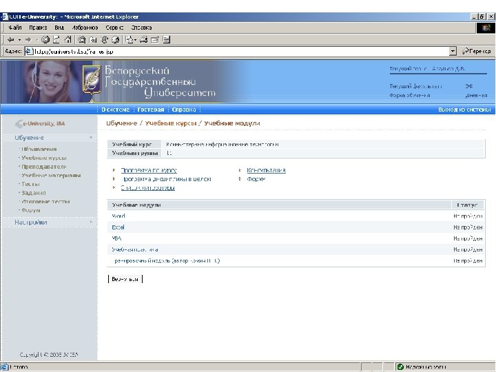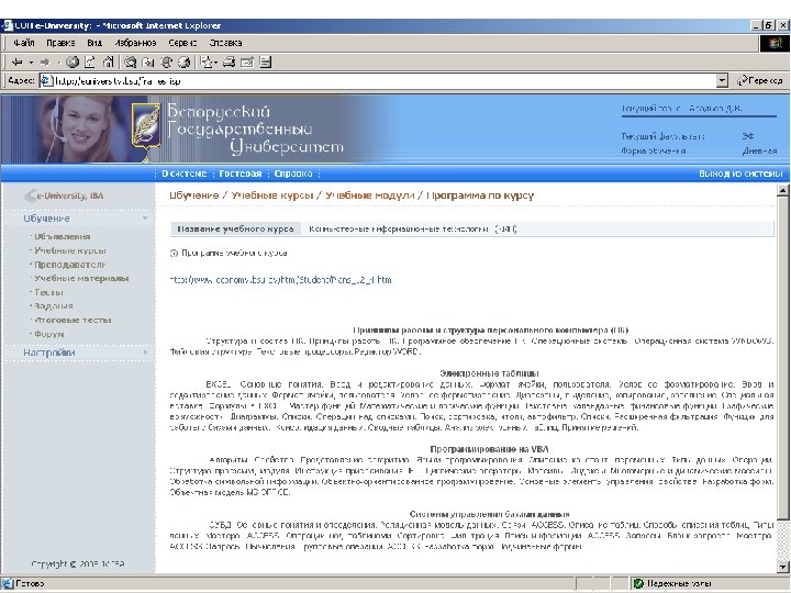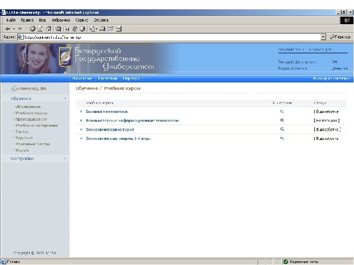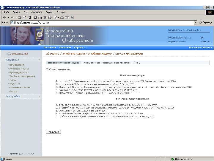 Информационные ресурсы курса http: // intranet. bsu – внутренняя сеть БГУ n http: //www. bsu. by - официальный сайт БГУ n http: // www. economy. bsu. by – официальный сайт экономического факультета n http: //euniversity. bsu. by – система дистанционного обучения студентов n http: //www. library. bsu. by – электронная библиотека БГУ n