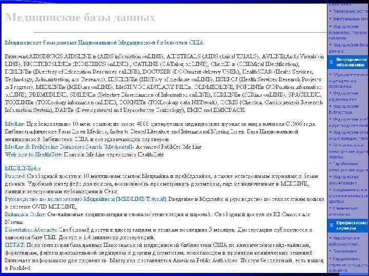 Книжные новинки в области медицины (с возможностью заказа нужной книги) – http: //www. e-book. com Самые последние новости по медицине – http: //wwwdash. com Доступ к 30 -ти медицинским базам данных – Medline, Embase, Biosys, Drug NL и др. (кстати, здесь же размещена единственная в мире коммерческая база данных патентных документов) – http: //www. fizkarlsruhe. de/;