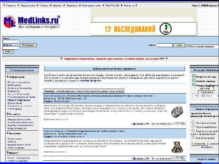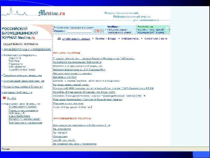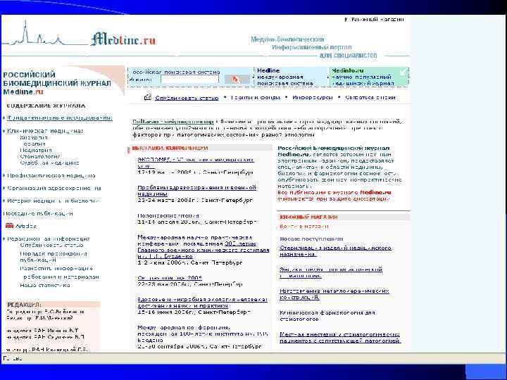Русский медицинский сервер – www. rusmedserv. com (представлен список 100 лучших российских медицинских серверов, разделы практически по всем областям медицины, медицинские базы данных, новостислужбы рассылки, многочисленные форумы);