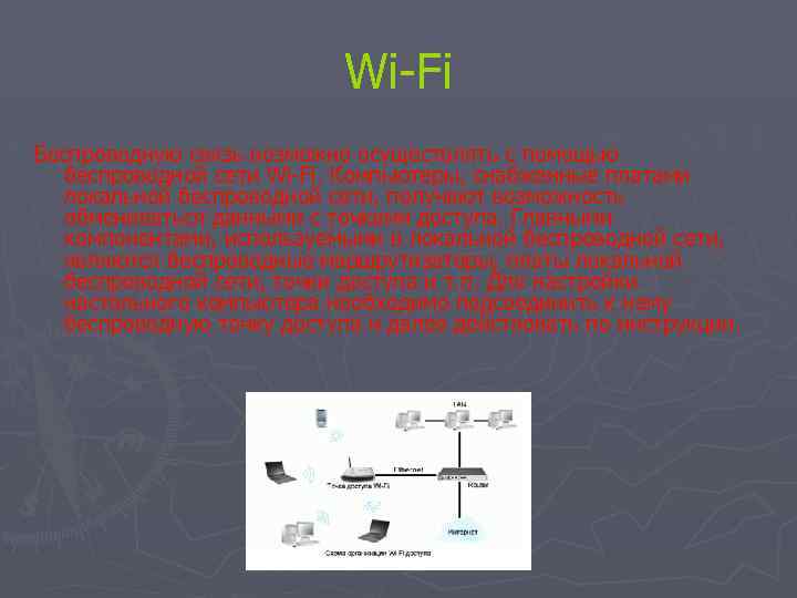 Wi-Fi Беспроводную связь возможно осуществлять c помощью беспроводной сети Wi-Fi. Компьютеры, снабженные платами локальной беспроводной сети, получают возможность обмениваться данными с точками доступа. Главными компонентами, используемыми в локальной беспроводной сети, являются беспроводные маршрутизаторы, платы локальной беспроводной сети, точки доступа и т. п. Для настройки настольного компьютера необходимо подсоединить к нему беспроводную точку доступа и далее действовать по инструкции.