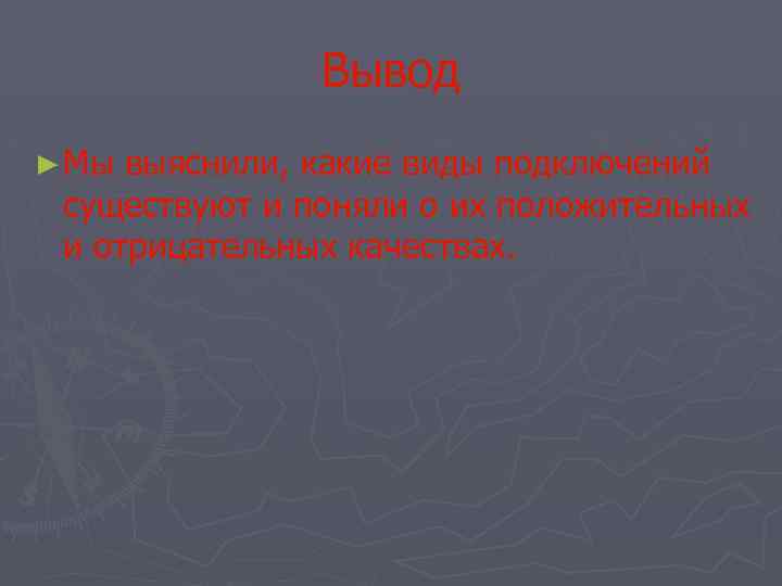 Вывод ► Мы выяснили, какие виды подключений существуют и поняли о их положительных и отрицательных качествах.