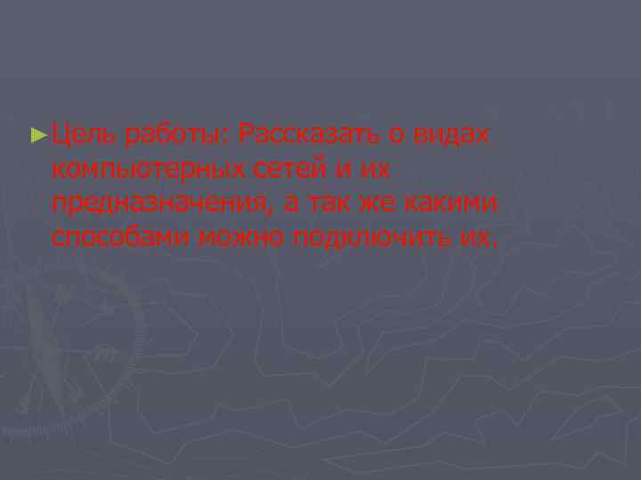 ► Цель работы: Рассказать о видах компьютерных сетей и их предназначения, а так же какими способами можно подключить их.