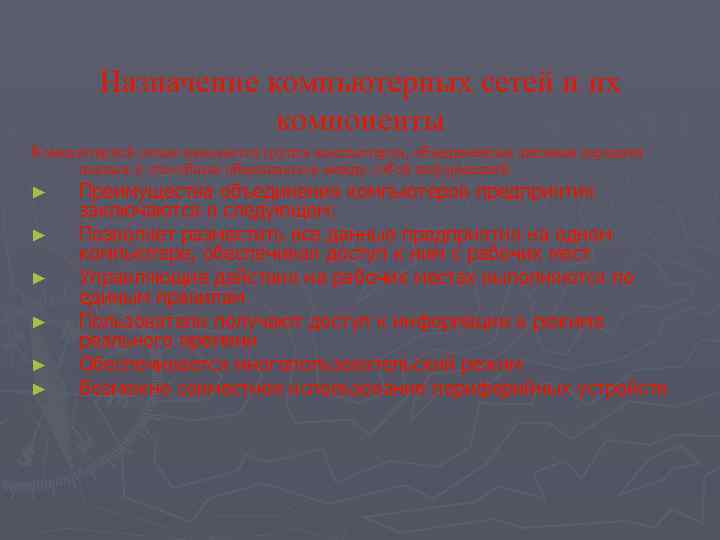 Назначение компьютерных сетей и их компоненты Компьютерной сетью называется группа компьютеров, объединенных линиями передачи данных и способных обмениваться между собой информацией. ► Преимущества объединения компьютеров предприятия ► ► ► заключаются в следующем: Позволяет разместить все данные предприятия на одном компьютере, обеспечивая доступ к ним с рабочих мест Управляющие действия на рабочих местах выполняются по единым правилам Пользователи получают доступ к информации в режиме реального времени Обеспечивается многопользовательский режим Возможно совместное использование периферийных устройств