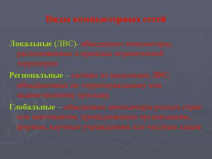 Виды компьютерных сетей Локальные (ЛВС)- объединяют компьютеры, расположенные в пределах ограниченной территории Региональные – состоят из нескольких ЛВС, объединенных по территориальному или ведомственному признаку Глобальные – объединяют компьютеры разных стран или континентов, принадлежащие организациям, фирмам, научным учреждениям или частным лицам