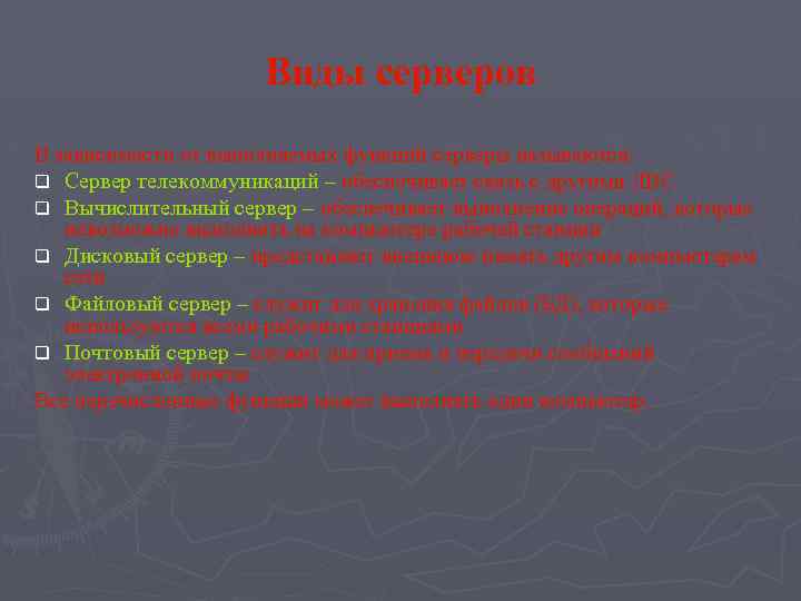 Виды серверов В зависимости от выполняемых функций серверы называются: q Сервер телекоммуникаций – обеспечивает связь с другими ЛВС q Вычислительный сервер – обеспечивает выполнение операций, которые невозможно выполнить на компьютере рабочей станции q Дисковый сервер – представляет внешнюю память другим компьютерам сети q Файловый сервер – служит для хранения файлов (БД), которые используются всеми рабочими станциями q Почтовый сервер – служит для приема и передачи сообщений электронной почты Все перечисленные функции может выполнять один компьютер.