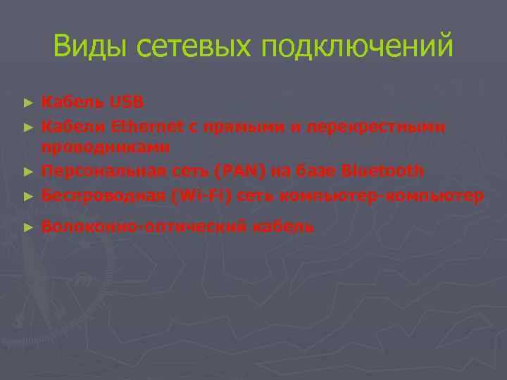 Виды сетевых подключений Кабель USB ► Кабели Ethernet с прямыми и перекрестными проводниками ► Персональная сеть (PAN) на базе Bluetooth ► Беспроводная (Wi-Fi) сеть компьютер-компьютер ► ► Волоконно-оптический кабель