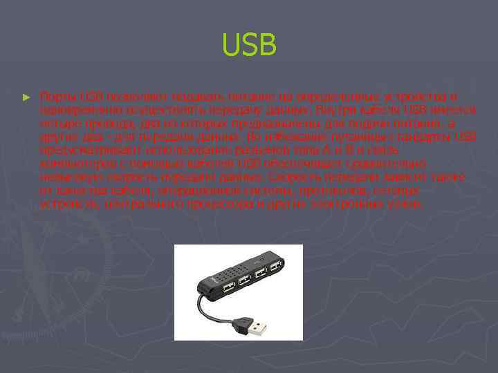 USB ► Порты USB позволяют подавать питание на определенные устройства и одновременно осуществлять передачу данных. Внутри кабеля USB имеется четыре провода, два из которых предназначены для подачи питания, а другие два - для передачи данных. Во избежание путаницы стандарты USB предусматривают использование разъемов типа A и B и связь компьютеров с помощью кабелей USB обеспечивает сравнительно невысокую скорость передачи данных. Скорость передачи зависит также от качества кабеля, операционной системы, протоколов, сетевых устройств, центрального процессора и других электронных узлов.