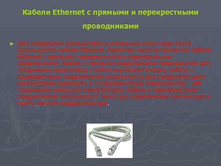 Кабели Ethernet с прямыми и перекрестными проводниками ► Для соединения компьютеров в локальных сетях чаще всего используются кабели Ethernet. Наиболее часто встречаются кабели Ethernet с прямыми, перекрестными и перевернутыми соединениями. Кабель с прямыми соединениями предназначен для соединения компьютера с хабом или коммутатором, кабель с перекрестными соединениями используется для соединения двух компьютеров напрямую, а с перевернутыми соединениями - для соединения хабов или коммутаторов. Кабель с перевернутыми соединениями используется также для подключения компьютера к порту консоли маршрутизатора.