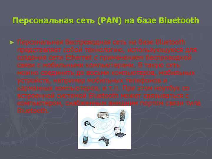 Персональная сеть (PAN) на базе Bluetooth ► Персональная беспроводная сеть на базе Bluetooth представляет собой технологию, использующуюся для создания сети Ethernet с применением беспроводной связи с мобильными компьютерами. В такую сеть можно соединить до восьми компьютеров, мобильных устройств, например мобильных телефонов и карманных компьютеров, и т. п. При этом ноутбук со встроенной системой Bluetooth может связываться с компьютером, снабженным внешним портом связи типа Bluetooth.