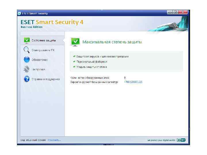 Функции антишпиона предупреждает, когда одна программа пытается запустить другую программу (это тоже может быть следствием работы вируса); закрывает от возможного доступа определенные сетевые порты компьютера; предупреждает о так называемом сканировании портов вашего компьютера, так как это может быть предвестником хакерской атаки; блокирует выполнение различных шпионских программ; предотвращает деструктивные действия троянских программ.