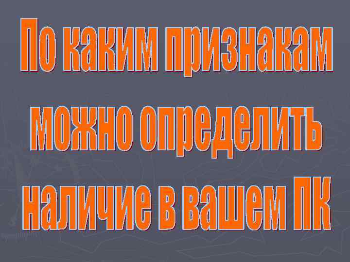 Косвенные признаки: è резко, без особой причины возросло число файлов è уменьшение объема оперативной памяти è уменьшение быстродействия программы è увеличение времени обращения к винчестеру è загорание индикаторной лампочки дисковода при отсутствия обращения к нему è частое зависание операционной системы è увеличение размера программных файлов è исчезновение файлов и целых программ и др.