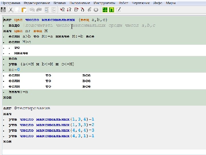 Подготовка заданий для учащихся • В "учительском" режиме Ку. Мира при редактировании программы можно делать невидимыми или неизменяемыми некоторые строки. • Ку. Мир позволяет создать файл-задание, скомпонованное из шаблона-заготовки программы, которую нужно дописать и блока (алгоритма) тестирования. • При этом учитель обычно делает блок тестирования невидимым для ученика.