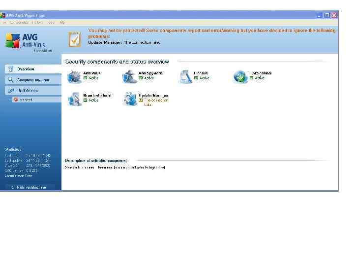 AVG Free Edition • Разработана чешской компанией Grisoft • AVG Free Edition - бесплатное приложение • AVG содержит несколько модулей, с помощью которых обеспечивается защита компьютера: – AVG Resident Shield - отвечает за основное действие антивируса, осуществляет проверку файлов на наличие вредоносных модулей – E-mail Scanner - осуществляет проверку входящей и исходящей почты – Internal Virus Database – информация о последнем обновлении антивирусных баз и – Scheduler – планировщик заданий – Update Manager - определяет настройки обновления AVG Free Edition – Virus Vault – осуществляет функцию "карантин", блокирующую доступ к подозрительным файлам