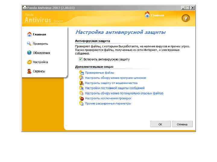 Panda Antivirus • Panda Antivirus производит обновления в фоновом режиме без запроса к пользователю при подключении к Интернет • Технология Panda Antivirus Titanium позволяет обнаружить и удалить вирус в почтовом послании до того, как вы его откроете, так что вирус не сможет проникнуть на ваш компьютер • Многие современные вирусы не только инфицируют файлы, но и изменяют параметры операционной системы. Panda Antivirus Titanium обладает собственной технологией Smart. Clean technology, позволяющей исправлять даже серьезные повреждения, нанесенные вирусом, в сложных случаях