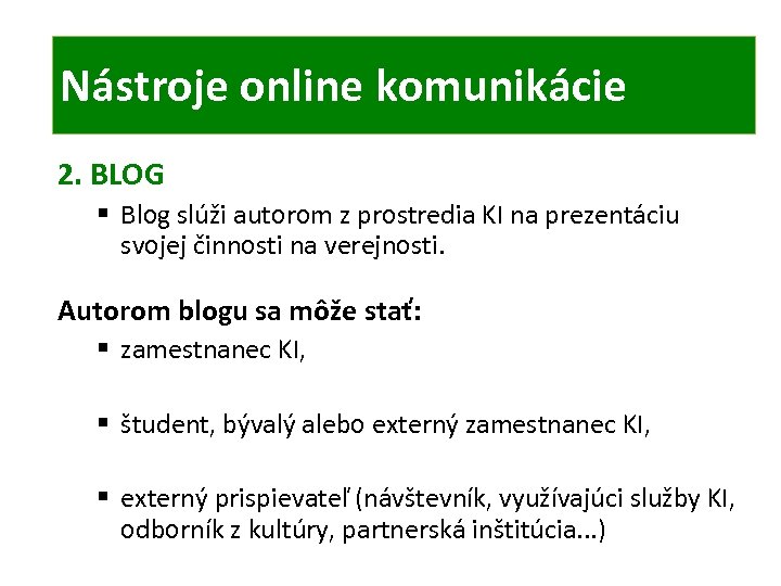 ONLINE KOMUNIKÁCIA TIC Nástroje online komunikácie 2. BLOG § Blog slúži autorom z prostredia KI na prezentáciu svojej činnosti na verejnosti. Autorom blogu sa môže stať: § zamestnanec KI, § študent, bývalý alebo externý zamestnanec KI, § externý prispievateľ (návštevník, využívajúci služby KI, odborník z kultúry, partnerská inštitúcia. . . )