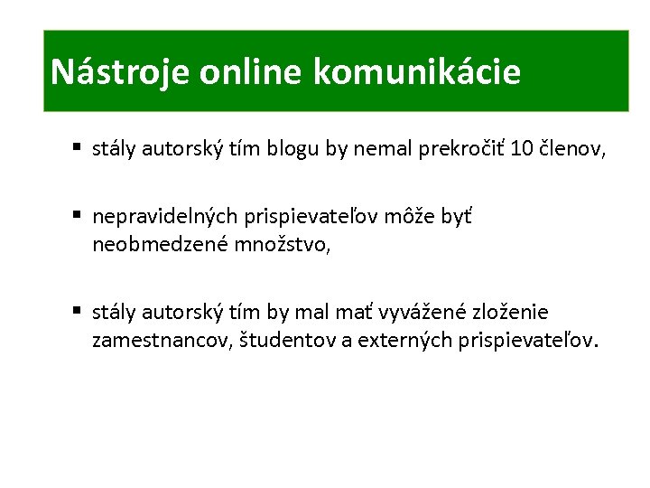 ONLINE KOMUNIKÁCIA TIC Nástroje online komunikácie § stály autorský tím blogu by nemal prekročiť 10 členov, § nepravidelných prispievateľov môže byť neobmedzené množstvo, § stály autorský tím by mal mať vyvážené zloženie zamestnancov, študentov a externých prispievateľov.