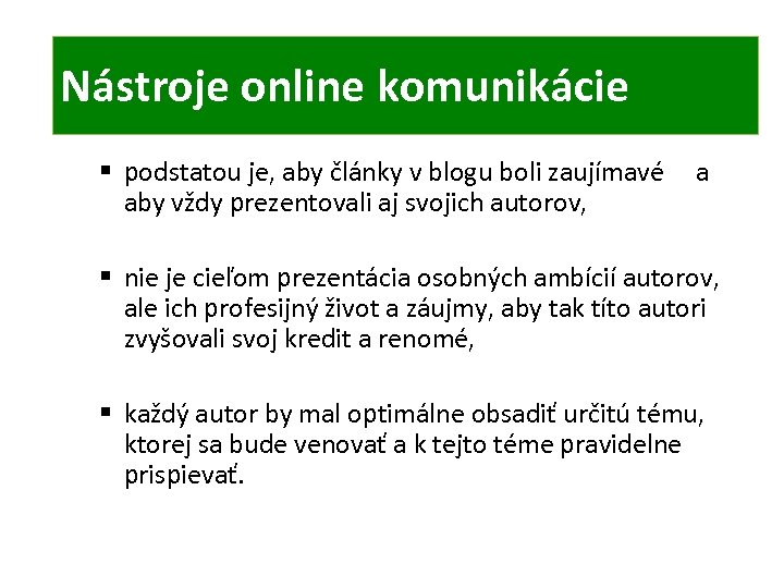 ONLINE KOMUNIKÁCIA TIC Nástroje online komunikácie § podstatou je, aby články v blogu boli zaujímavé a aby vždy prezentovali aj svojich autorov, § nie je cieľom prezentácia osobných ambícií autorov, ale ich profesijný život a záujmy, aby tak títo autori zvyšovali svoj kredit a renomé, § každý autor by mal optimálne obsadiť určitú tému, ktorej sa bude venovať a k tejto téme pravidelne prispievať.