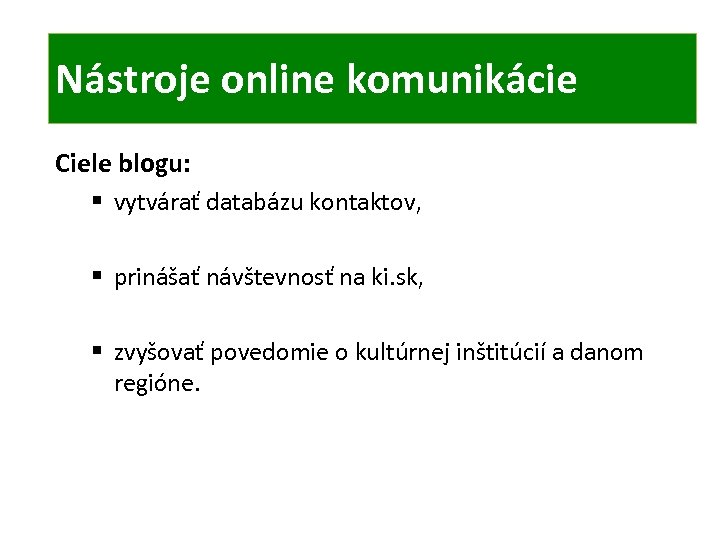 ONLINE KOMUNIKÁCIA TIC Nástroje online komunikácie Ciele blogu: § vytvárať databázu kontaktov, § prinášať návštevnosť na ki. sk, § zvyšovať povedomie o kultúrnej inštitúcií a danom regióne.