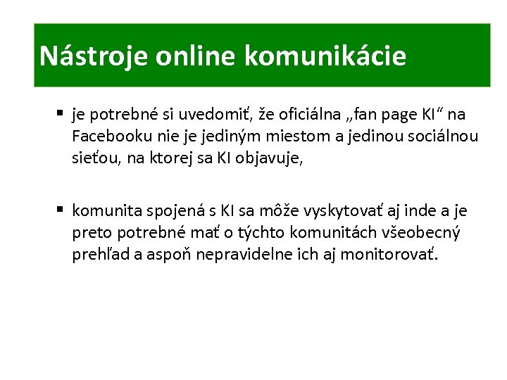 ONLINE KOMUNIKÁCIA TIC Nástroje online komunikácie § je potrebné si uvedomiť, že oficiálna „fan page KI“ na Facebooku nie je jediným miestom a jedinou sociálnou sieťou, na ktorej sa KI objavuje, § komunita spojená s KI sa môže vyskytovať aj inde a je preto potrebné mať o týchto komunitách všeobecný prehľad a aspoň nepravidelne ich aj monitorovať.