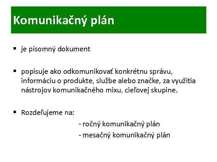 Komunikačný plán § je písomný dokument § popisuje ako odkomunikovať konkrétnu správu, informáciu o produkte, službe alebo značke, za využitia nástrojov komunikačného mixu, cieľovej skupine. § Rozdeľujeme na: - ročný komunikačný plán - mesačný komunikačný plán