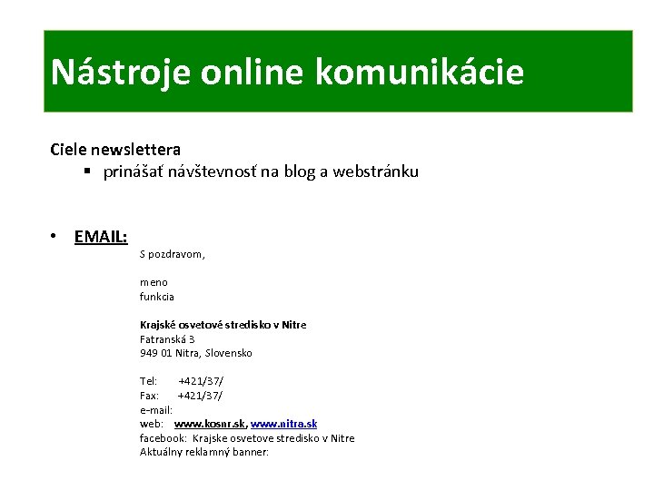 ONLINE KOMUNIKÁCIA TIC Nástroje online komunikácie Ciele newslettera § prinášať návštevnosť na blog a webstránku • EMAIL: S pozdravom, meno funkcia Krajské osvetové stredisko v Nitre Fatranská 3 949 01 Nitra, Slovensko Tel: +421/37/ Fax: +421/37/ e-mail: web: www. kosnr. sk, www. nitra. sk facebook: Krajske osvetove stredisko v Nitre Aktuálny reklamný banner: