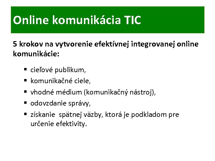 Online komunikácia TIC 5 krokov na vytvorenie efektívnej integrovanej online komunikácie: § § § cieľové publikum, komunikačné ciele, vhodné médium (komunikačný nástroj), odovzdanie správy, získanie spätnej väzby, ktorá je podkladom pre určenie efektivity.