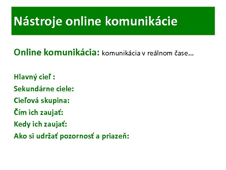 Nástroje online komunikácie Online komunikácia: komunikácia v reálnom čase. . . Hlavný cieľ : Sekundárne ciele: Cieľová skupina: Čím ich zaujať: Kedy ich zaujať: Ako si udržať pozornosť a priazeň: