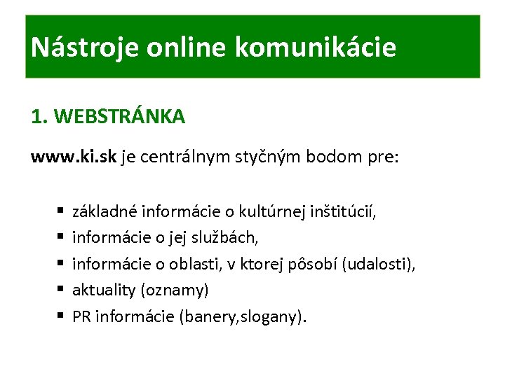 Nástroje online komunikácie 1. WEBSTRÁNKA www. ki. sk je centrálnym styčným bodom pre: § § § základné informácie o kultúrnej inštitúcií, informácie o jej službách, informácie o oblasti, v ktorej pôsobí (udalosti), aktuality (oznamy) PR informácie (banery, slogany).