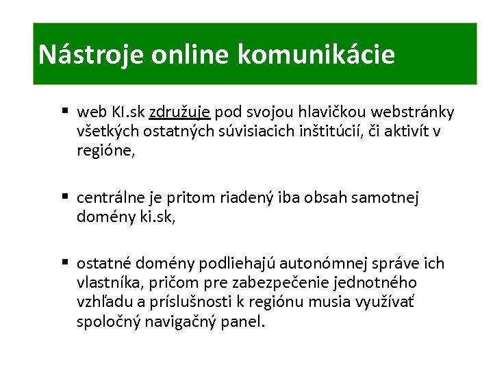 ONLINE KOMUNIKÁCIA TIC Nástroje online komunikácie § web KI. sk združuje pod svojou hlavičkou webstránky všetkých ostatných súvisiacich inštitúcií, či aktivít v regióne, § centrálne je pritom riadený iba obsah samotnej domény ki. sk, § ostatné domény podliehajú autonómnej správe ich vlastníka, pričom pre zabezpečenie jednotného vzhľadu a príslušnosti k regiónu musia využívať spoločný navigačný panel.