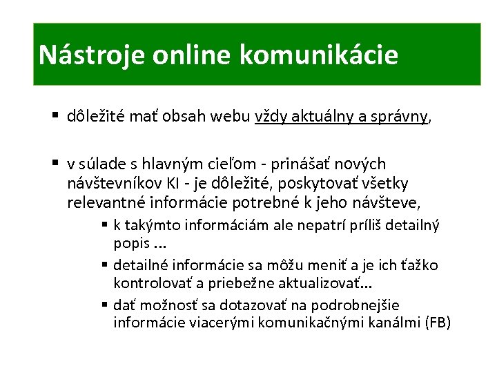ONLINE KOMUNIKÁCIA TIC Nástroje online komunikácie § dôležité mať obsah webu vždy aktuálny a správny, § v súlade s hlavným cieľom - prinášať nových návštevníkov KI - je dôležité, poskytovať všetky relevantné informácie potrebné k jeho návšteve, § k takýmto informáciám ale nepatrí príliš detailný popis. . . § detailné informácie sa môžu meniť a je ich ťažko kontrolovať a priebežne aktualizovať. . . § dať možnosť sa dotazovať na podrobnejšie informácie viacerými komunikačnými kanálmi (FB)