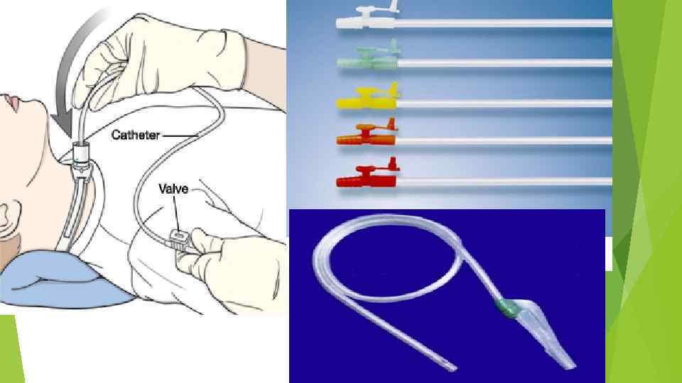 Ø Основная задача медсестры, осуществляющей туалет ТБД, - поддерживать постоянную хорошую проходимость трахеостомитческой трубки (канюли) и дыхательных путей, предотвращать развитие инфекции, высыхания слизистых оболочек, кровотечения и других осложнений. Ø Салфетку, подложенную под щиток канюли менять по мере загрязнения, но не реже 2 раз в сутки! Кожу вокруг канюли обрабатывают 3 % перекисью водорода и хлоргексидином или этиловым спиртом. При наличии гнойных выделений под салфетку наносят йодсодержащую мазь Бетадин. Ø Ленточки меняем 2 раза в день, либо чаще. Ø Манипуляцию выполняют в стерильных перчатках с соблюдением асептики. Ø Для отсасывания слизи из трахеи следует использовать стерильный пластиковый катетер, смоченный стерильным раствором. Ø Диаметр катетера должен быть в 2 -3 раза меньше диаметра трубки. Ø Перед введением катетера голову больного поворачивают противоположную бронху, из которого производится отсасывание. Ø Катетер вводят присоединенным его к выключенному отсосу (либо с открытым окошечком вакуум-контроля) на необходимую глубину, почувсвовав препятствие катетер дальше не продвигают, а извлекают при включенном (с закрытым окошечком). Ø Если аспирируется очень вязкая мокрота, в трубку следует ввести 5 – 8 мл физраствора с последующей его аспирацией в сторону,