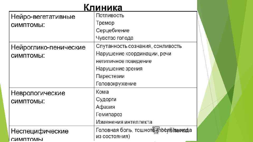 Фазы Голод, потливость Возбуждение: злобность, агрессивность, галлюцинации Судорги, апатия, оглушенность, сонливость Кома Объективно: Кожа бледная, влажная, язык влажный Тонус глазных яблок в норме или повышен Тонус мышц повышен Сухожильные рефлексы повышены, симптом Бабинского Дыхание обычное Температура тела нормальная ЧСС увеличена, АД в норме или повышено Особенно опасными гипогликемии могут быть при ИБС: могут провоцировать ИМ, инсульт (снять ЭКГ!). Легкие гипогликемии проходят бесследно. Тяжелые, длительные, чистые гипогликемии приводят к диабетической энцефалопатии и деградации личности