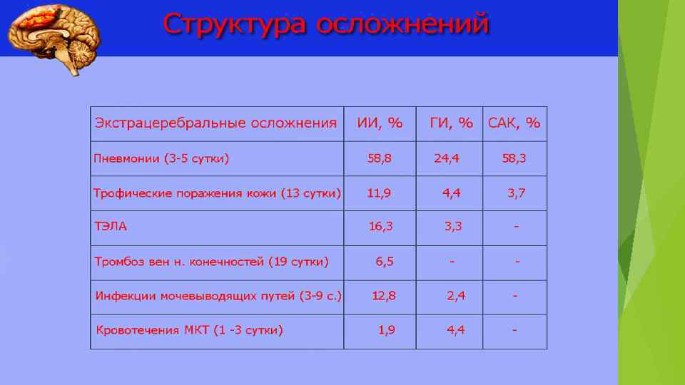 Дифференцированное лечение больных при инсультах при геморрагическом инсульте и субарахноидальном кровоизлиянии требует дополнительного назначения гемостатических средств в течение 3 -6 недель: транексамовой кислоты, дицинона (этамзилата). Оперативное лечение при геморрагических инсультах, САК (клипирование аневризмы, удаление внутримозговых гематом) При ишемическом инсульте необходимо сразу улучшить микроциркуля цию в зоне ишемии. С этой целью показаны дезагреганты, антикоагулянты, антигипоксанты.