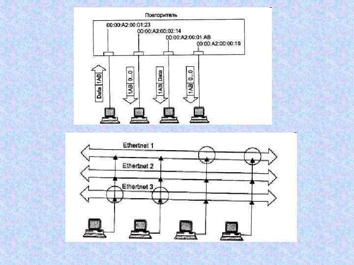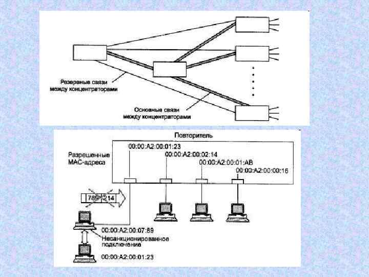 Концентратор (hub, хаб) Функции концентраторов: • регенерация сигнала • объединение сегментов разного типа • встроенные трансиверы • AUI(Attachment Unit Interface)-порты • автосегментация • некорректные кадры • частые коллизии • jabbing • поддержка резервных связей • защита от НСД • фильтр МАС-адресов • коррекция поля данных • поддержка VLANs • управление по протоколу SNMP