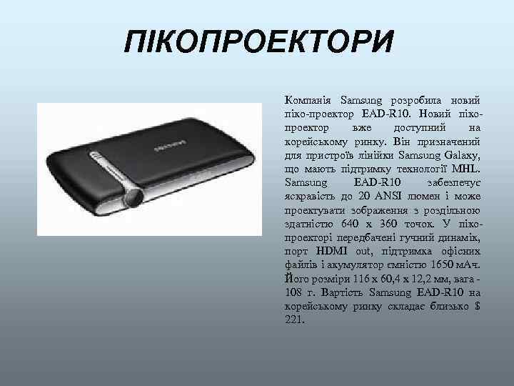 ПІКОПРОЕКТОРИ Компанія Samsung розробила новий піко-проектор EAD-R 10. Новий пікопроектор вже доступний на корейському ринку. Він призначений для пристроїв лінійки Samsung Galaxy, що мають підтримку технології MHL. Samsung EAD-R 10 забезпечує яскравість до 20 ANSI люмен і може проектувати зображення з роздільною здатністю 640 х 360 точок. У пікопроекторі передбачені гучний динамік, порт HDMI out, підтримка офісних файлів і акумулятор ємністю 1650 м. Ач. Його розміри 116 х 60, 4 х 12, 2 мм, вага - 108 г. Вартість Samsung EAD-R 10 на корейському ринку складає близько $ 221.