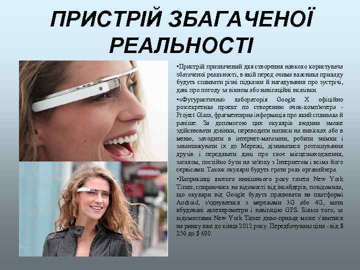 ПРИСТРІЙ ЗБАГАЧЕНОЇ РЕАЛЬНОСТІ • Пристрій призначений для створення навколо користувача збагаченої реальності, в якій перед очима власника приладу будуть спливати різні підказки й нагадування про зустрічі, дані про погоду за вікном або навігаційні вказівки. • «Футуристична» лабораторія Google X офіційно розсекретила проект по створенню очок-комп'ютера - Project Glass, фрагментарна інформація про який спливала й раніше. За допомогою цих окулярів людина зможе здійснювати дзвінки, переводити написи на вивісках або в меню, заходити в інтернет-магазини, робити знімки і завантажувати їх до Мережі, дізнаватися розташування друзів і передавати дані про своє місцезнаходження, загалом, постійно бути на зв'язку з Інтернетом і всіма його сервісами. Також окуляри будуть грати роль органайзера. • Наприкінці лютого нинішнього року газета New York Times, спираючись на відомості від інсайдерів, повідомила, що окуляри від Google будуть працювати на платформі Android, з'єднуватися з мережами 3 G або 4 G, мати вбудовані акселерометри і навігацію GPS. Більш того, за відомостями New York Times диво-прилад може з'явитися на ринку вже до кінця 2012 року. Передбачувана ціна - від $ 250 до $ 600.