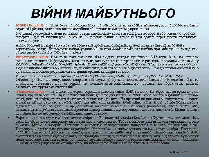 ВІЙНИ МАЙБУТНЬОГО • • Бомби-сюрпризи. У США була розроблена міна, розривши якій не наносить поранень, але поширює в повітрі аерозолі і рідини, здатні викликати свербіння або приспати солдатів супротивника. У Франції розробили хімічні речовини, здатні «приклеїти» колеса автомобілів до дороги або, навпаки, зробити поверхню дорогі неймовірно слизькою. Їх розпилювання з літака нібито здатне паралізувати транспортні системи ворогів. Армія оборони Ізраїлю готується застосовувати проти палестинських демонстрантів синтетичні бомби з «ароматом» скунса. Як показали випробування, убити така бомба не уб'є, але пам'ять про себе залишить надовго: розрахункова стійкість смороду - 5 років! Інфразвукова зброя. Власна частота коливань тіла людини складає приблизно 8 -15 герц. Коли на організм починають впливати інфразвуком такої частоти, коливання тіла потрапляють в резонанс із звуковою хвилею, і у людини починаються мікросудоми. Зрозуміти, що з ним відбувається, людина не може, інфразвук не чутний, але людина починає битися в конвульсіях, як епілептик, у нього виникає відчуття жаху. При достатньо могутній дії в організмі починають розриватися внутрішні органи, капіляри і судини. Реальне втілення в життя інфразвукова зброя отримала в «звукових рушницях» - пристроях розміром з бейсбольну біту, що випускають направлений звуковий промінь потужністю близько 140 децибел. Одного «пострілу» достатньо, щоб на довгий час знешкоджити найсильнішого чоловіка. Це зброя зараз активно застосовують групи захоплення ФБР. Генетична зброя — це біологічна зброя, отримана шляхом зміни ДНК людини. Ця зброя зможе вражати одні етнічні групи населення і бути абсолютно нешкідливою для інших. У основі його лежать відмінності в групах крові, кольорі шкіри, генетичній структурі різних народностей. На практиці це повинно виглядати так — певна кількість людей заражає вірусом, який для них нешкідливий. Вони лише носії. Вірус розповсюджується в суспільстві і починає діяти. У представників цільових категорій населення (наприклад, темношкірих, або, навпаки, слов'ян) з'являються важкі хронічні захворювання, вони втрачають здатність мати дітей. Кінець кінцем, це приводить до поступового вимирання певного етносу. Україна - один з лідерів в області точних озброєнь. Високоточні засоби «Комбат» і «Стугна» не мають аналогів в світі. Ця зброя діє по лазерному підсвічуванню в хвіст ракети. Тобто польотом ракети можна управляти, просто рухаючи рукою з лазером. Технологія забезпечує безперешкодне попадання в мішень на відстані 5 км. Популярною є унікальна українська розробка «Каштан-3» — система захисту від високоточної зброї. Принцип її роботи полягає в створенні перешкод для ракет з лазерним підсвічуванням. Наприклад, навколо АЕС виставляється могутнє підсвічування, що відводить снаряд супротивника в безпечну зону від об'єкту. Цей захист може застосовуватися на командних пунктах, вузлах зв'язку і інших на стратегічно важливих об'єктах. «Каштан» — це ще з серії радянських мегапроектів, які почали розроблятися як протикосмічне озброєння. Опанасюк А. С.