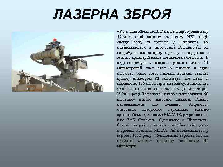ЛАЗЕРНА ЗБРОЯ • Компанія Rheinmetall Defence випробувала нову 50 -кіловатний лазерну установку HEL (highenergy laser) на полігоні у Швейцарії. Як повідомляється в прес-релізі Rheinmetall, на випробуваннях лазерну гармату інтегрували з зенітно-артилерійським комплексом Oerlikon. В ході випробувань лазерна гармата пробила 15 міліметровий лист сталі з відстані в один кілометр. Крім того, гармата вразила сталеву кульку діаметром 82 міліметра, що летів зі швидкістю 180 кілометрів на годину, а також два безпілотних апарати на відстані у два кілометри. У 2013 році Rheinmetall планує випробувати 60 кіловатну версію лазерної гармати. Раніше повідомлялося, що компанія збирається оснастити лазерними гарматами зенітноартилерійські комплекси MANTIS, розроблені на базі ЗАК Oerlikon. Одночасно з Rheinmetall бойові лазерні установки розробляє німецький підрозділ компанії MBDA. Як повідомлялося у вересні 2012 року, 40 -кіловатна гармата змогла пробити сталеву пластину товщиною 40 міліметрів