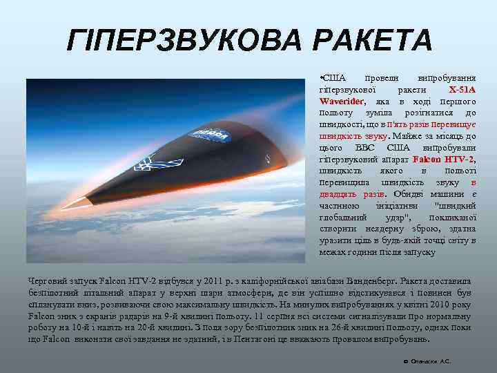 ГІПЕРЗВУКОВА РАКЕТА • США провели випробування гіперзвукової ракети X-51 A Waverider, яка в ході першого польоту зуміла розігнатися до швидкості, що в п'ять разів перевищує швидкість звуку. Майже за місяць до цього ВВС США випробували гіперзвуковий апарат Falcon HTV-2, швидкість якого в польоті перевищила швидкість звуку в двадцять разів. Обидві машини є частиною ініціативи "швидкий глобальний удар", покликаної створити неядерну зброю, здатна уразити ціль в будь-якій точці світу в межах години після запуску Черговий запуск Falcon HTV-2 відбувся у 2011 р. з каліфорнійської авіабази Ванденберг. Ракета доставила безпілотний літальний апарат у верхні шари атмосфери, де він успішно відстикувався і повинен був спланувати вниз, розвиваючи свою максимальну швидкість. На минулих випробуваннях у квітні 2010 року Falcon зник з екранів радарів на 9 -й хвилині польоту. 11 серпня всі системи сигналізували про нормальну роботу на 10 -й і навіть на 20 -й хвилині. З поля зору безпілотник зник на 26 -й хвилині польоту, однак поки що Falcon виконати свої завдання не здатний, і в Пентагоні це вважають провалом випробувань. Опанасюк А. С.