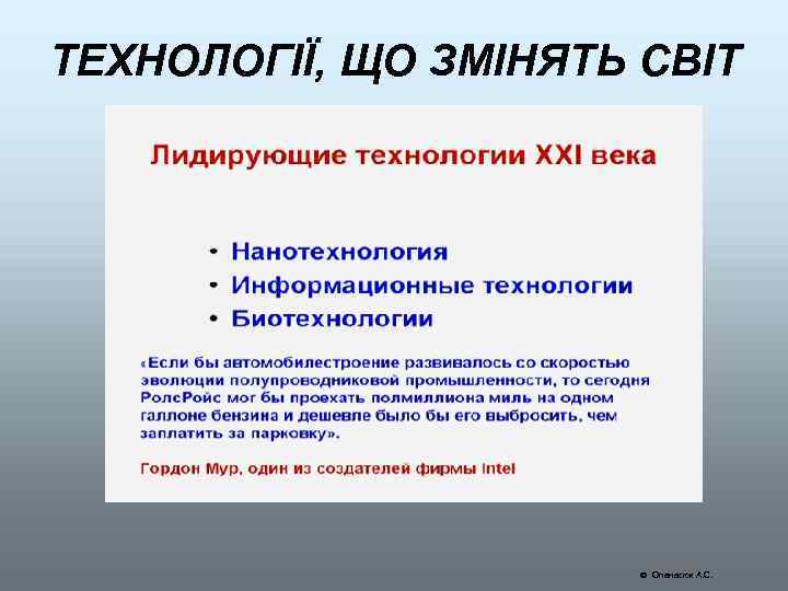 НАНОТЕХНОЛОГІЇ • Будь-який матеріальний предмет - це всього лише скупчення атомів у просторі. Те, як ці атоми зібрані в структуру, визначає, що це буде за предмет. • Термін "нанотехнології" в 1974 році запропонував японець Норіо Танігучі для опису процесу створення нових об'єктів і матеріалів за допомогою маніпуляцій з окремими атомами. Нанотехнології мають справу з об'єктами в одну мільярдну частину метра, тобто розміром з атом. Перші технічні засоби в цій області були винайдені в Швейцарській лабораторії IBM. • У 1982 році був створений растровий тунельний мікроскоп, який дозволяє розрізняти окремі атоми. Цей винахід через чотири роки був відзначений Нобелівською премією. • В 1986 році з'явився атомний силовий мікроскоп. На відміну від колишніх електронних приладів, які дозволяли лише спостерігати мікросвіт, нові прилади (їх правильніше було б назвати нанозондами) дають можливість його змінювати, наприклад, будувати з атомів молекули з прогнозованими властивостями. • Коли йдеться про розвиток нанотехнологій, маються на увазі три основні напрями: виготовлення електронних схем (у тому числі і об'ємних) з активними елементами, розмірами, порівнянними з розмірами молекул і атомів; • розробка і виготовлення наномашин, тобто, механізмів і роботів розміром з молекулу; • безпосередня маніпуляція атомами і молекулами і збірка з них всього існуючого. Опанасюк А. С.