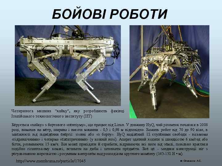 БОЙОВІ РОБОТИ Чотиринога машина "хайку", яку розробляють фахівці Італійського технологічного інституту (IIT) Керується «хайку» з бортового «пентіуму» , що працює під Linux. У довжину Hy. Q, чий розвиток почалося в 2008 році, вимахав на метр, ширина і висота машини - 0, 5 і 0, 98 м відповідно. Важить робот від 70 до 90 кіло, в залежності від підведення енергії: ззовні або «з борту» . Hy. Q наділений 12 ступенями свободи - вісьмома «гідравлічними» і чотирма «електричними» (у кожній нозі). Апарат здатний ходити зі швидкістю 6 км/год або бігти, розвиваючи 15 км/ч. Він може присідати й стрибати, відриваючи всі ноги від землі, повільно крастися подібно гігантському комасі, вставати на диби і штовхати предмети. Все це - завдяки конструкції ніг з регульованою жорсткістю і розумним контролем над розподілом крутного моменту (145 -152 H • м). http: //www. membrana. ru/particle/17045 Опанасюк А. С.